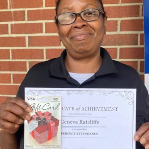We would like to recognize Geneva Ratcliffe on being the perfect attendance winner for September. In recognition for her perfect attendance, Geneva was awarded a $50 Visa gift card. Thank you Geneva! Keep up the great work!