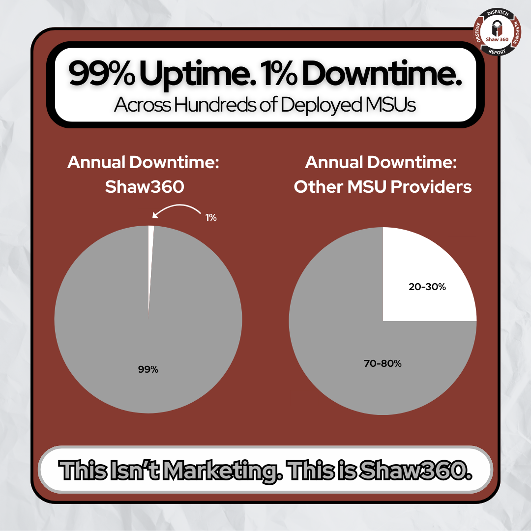 Many MSU providers experience downtime rates in the 20–30% range, meaning their units can be offline, underperforming, or unavailable for extended periods. That gap is not insignificant. It represents real hours, sometimes days, when a site lacks the visibility it expects and the protection it depends on.